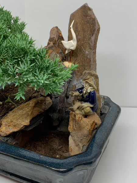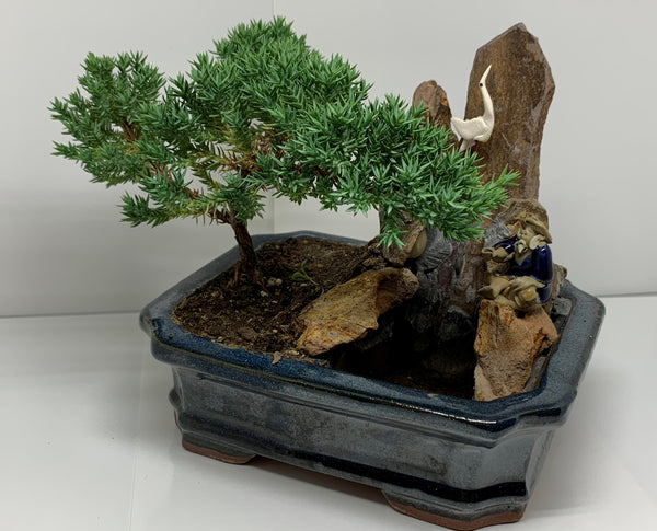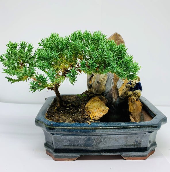 - Square shaped Bonsai ceramic pot, fresh soil, locally cultivated bonsai tree and assorted decor.
